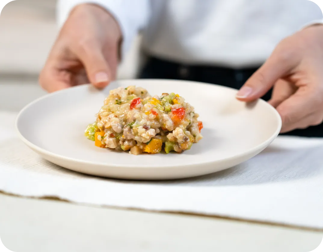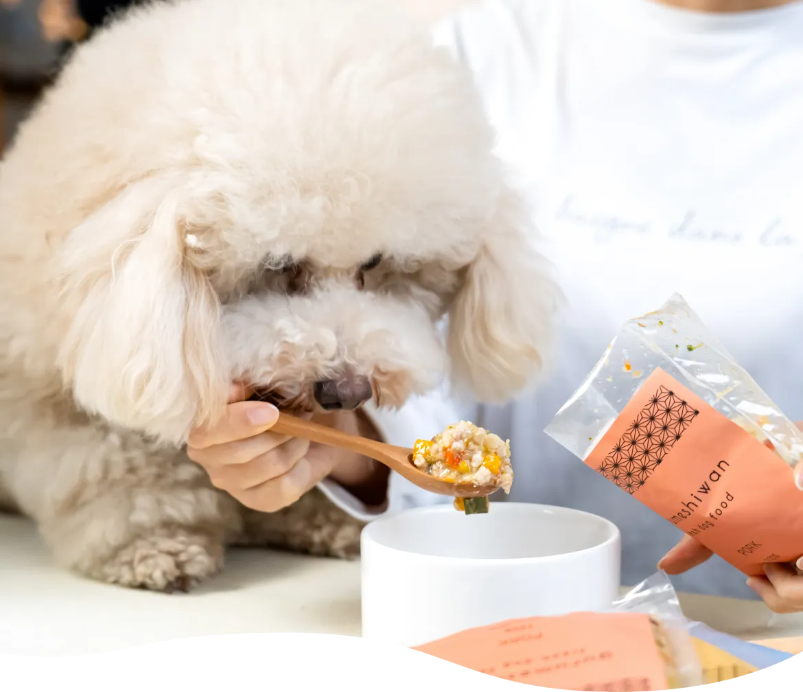 何度も試作を重ね、水分量とくず粉の分量を調整し、出汁にとろみをつけることで食材をなめとりやすくなり、喉ごしが良くなることでシニア犬にも食べやすいよう開発しました。